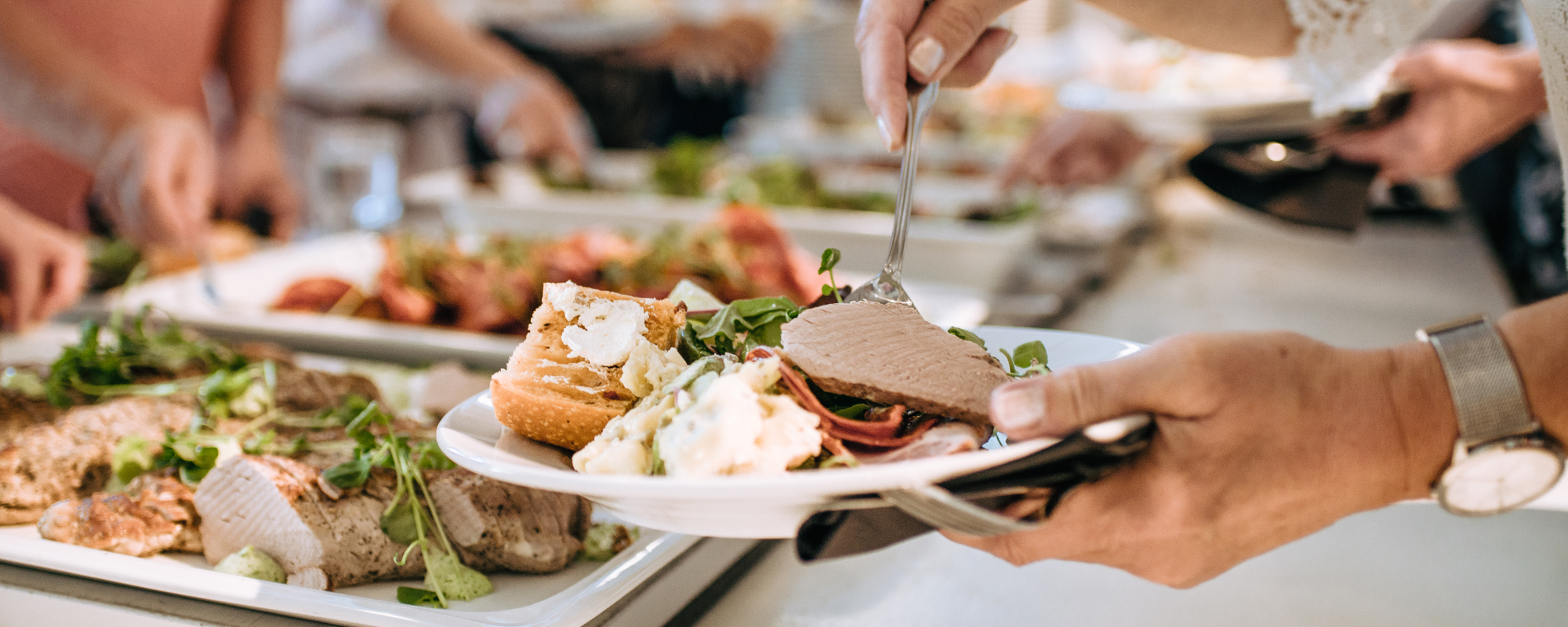 stort salladsbord, smör, bröd, kaffe och kaka